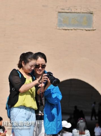 8月10日,兩名游客在嘉峪關城門前查看照片。