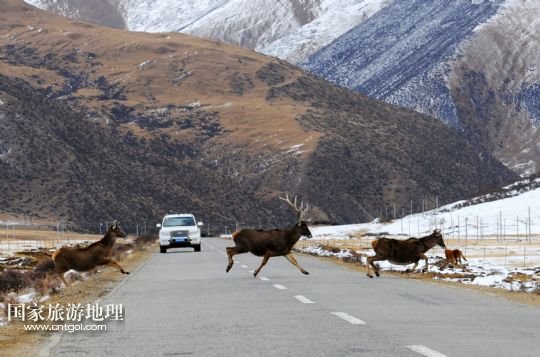 西藏工布江達(dá)縣境內(nèi) 白唇鹿群過(guò)公路(圖)