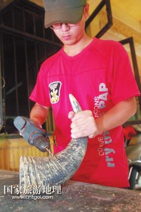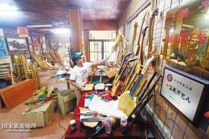 國(guó)家旅游地理 廣西柳州11月11日訊(記者陸旺楊春) 牽手漫步龍?zhí)睹琅希⒓缈勘炽逶⊥砬锱?yáng),你會(huì)時(shí)常聽到一串串動(dòng)人的音符:它時(shí)而渾厚圓潤(rùn)、清脆響亮,時(shí)而輕靈縹緲、悠長(zhǎng)凄美。不忍打破這份寂靜閑情,卻又忍不住猜想:這是何方人士,用何種樂(lè)器,吹拉彈撥出如此佳音?穿越叢林,循聲走去,瑤寨庭前,幾個(gè)年輕男女手握蘆笙,身子左搖右晃,吹得正起興。步入瑤寨一樓才發(fā)現(xiàn),這里儼然一個(gè)生產(chǎn)民族樂(lè)器的大工廠:木板、竹竿、鐵鋸、膠水、油漆,以及形狀酷似牛頭、牛腿、魚身、龍身等顏色各異、五花八門的樂(lè)器……一位正在給樂(lè)器上漆的中年人梁志榮告訴記者,這是龍?zhí)豆珗@正在籌建的民族樂(lè)器館,也是魚峰區(qū)創(chuàng)建廣西文化強(qiáng)區(qū)的特色景區(qū)之一,他現(xiàn)在是大龍?zhí)睹褡逅囆g(shù)團(tuán)團(tuán)長(zhǎng),研究、制作民族樂(lè)器將近20年,曾獲“廣西民間工藝大師”和“十佳民間藝人”稱號(hào)。