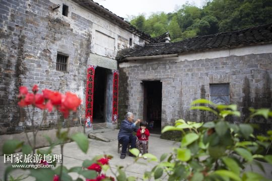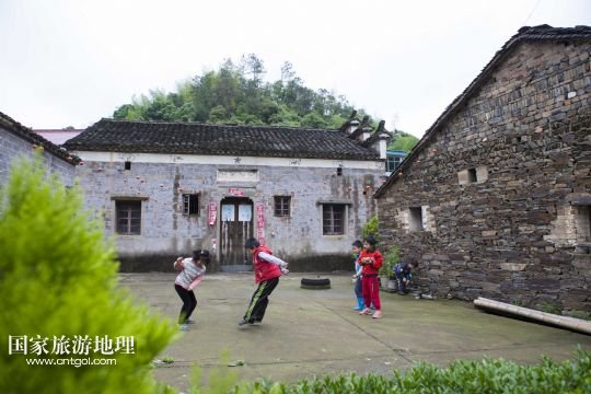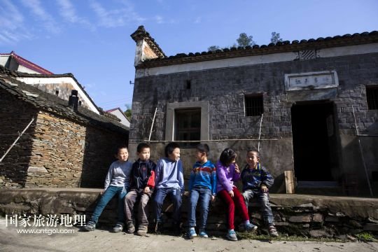 國家旅游地理 江西九江5月12日訊 5月12日,孩子們坐在土目源村的老房子前玩耍??沼牡纳焦龋幌⒌南鳎唏g的石墻,古樸的石屋。在江西省北部山區(qū),有一座石屋山居的古村落——都昌縣大港鎮(zhèn)土目源村。