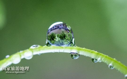 5月11日,土目源村的石屋倒映在水滴里(照片翻轉180度)。