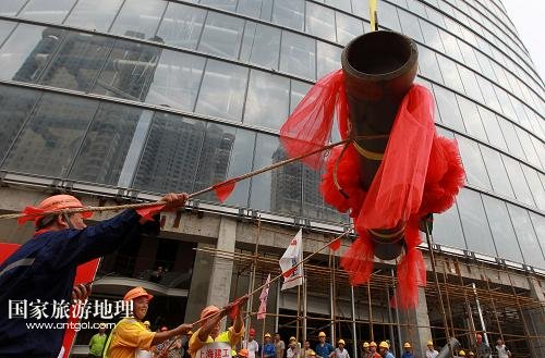 8月3日,上海機(jī)械施工集團(tuán)公司的工程人員在“申城之巔”慶祝塔冠結(jié)構(gòu)工程完工。