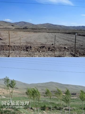 國(guó)家旅游地理 寧夏中衛(wèi)6月9日訊 上圖上:2014年5月的資料照片上甘鹽池一片荒涼;上圖下:6月4日,記者拍攝的甘鹽池已是綠意盎然(拼版照片)。寧夏海原縣甘鹽池地處黃土高原干旱帶上,平均海拔約2100米,年均降雨量在280毫米左右,自然災(zāi)害頻繁,十年九旱。2014年以前,這片近12萬(wàn)畝的土地可謂一片荒蕪。2014年,海原縣甘鹽池管委會(huì)通過(guò)確立“盆地改良、種草養(yǎng)羊、綠化美化、提升人氣”的工作思路,對(duì)2.2萬(wàn)畝砂石地和山坡地進(jìn)行改良和治理,如今甘鹽池滿滿的綠意讓人為之一振。 新華社記者 李然 攝